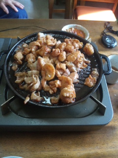 そして、なんと言っても看板メニューは「ホルモン焼き」!!! これが絶品なんです!!!お昼は定食、夜はテーブルの上に直にコンロと鉄皿を置いて、目の前で焼いてくれます! ![]() 今日は、そのホルモン焼きを試食させて頂きました!お肉はとってもジューシーで、お肉に辛味噌を付けて食べるのですが、この辛味噌もまた絶品!!!それもそのはず、この辛味噌は、ともゑさん自家製の辛味噌で、ピリッと辛くて、とっても美味しいんです!!!