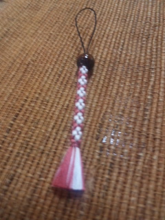 「間々田ひも」とは、手編みの日本古来のひもで、昭和に入って、民芸研究家の方によって「間々田ひも」と名付けられました。現在、栃木県の伝統工芸品にも指定されています。その昔は武士の刀の下げ緒(刀を身体に付けておくためのひも)などに使われていました。今は、女性の帯紐やイヤリング、ピアス、ストラップなども作られています。 ![]() 今回、その間々田ひもで作られたストラップをご用意して頂きました!赤と白の糸を束にし、それを編み込んで、1本に太いひもにしています。
