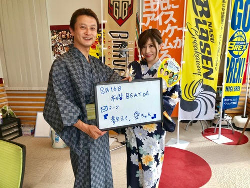 浴衣ウィーク!今日は「フェス」だよ!火曜【B・E・A・T】 黒後聡佑(クロスケ)& 須賀 由美子(すがゆみ)コンビが、 スタジオBHILLSから、生・放・送です! 今日のメッセージテーマは 【 みんなでフェスを作ってみよう! 】です! フェスっていえば、音楽はもちろん! 「フェス飯」と呼ばれるグルメ! 映えるフォトスポット、、、アトラクション があったり 自由な空間! 今日は…フェスで、こんなアーティストが見たい! この曲が聴きたい!こんなものが食べたい!! こんなことをしたい!会場はここが良い!! という 「フェス」のコンテンツを教えてください! ![]() フェスに行ったことがある方は、感想や反省点、 注意事項なども送ってくださいね~!! それでは、火曜BEAT!! 19時まで、すがゆみ&クロスケを、、、よっろしく~♪ 今日は「ゆみ小料理屋」もOPEN♪ 「素麺レシピ」を教えてどす♪ ![]() すがちゃん、早着替えに成功♪正解は濃紺色の浴衣! |