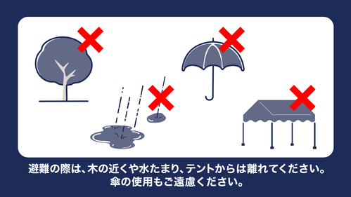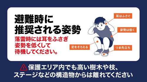 雷雲の接近が予想される場合は、ご自身から最も近い雷保護エリアへ避難をお願いします。