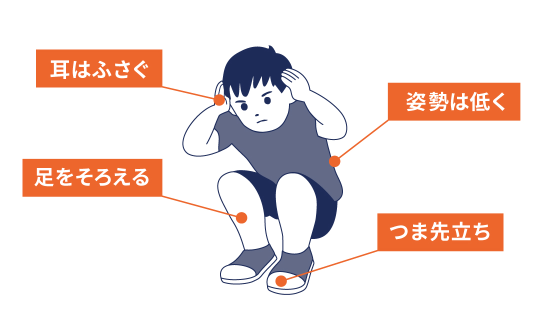 雷保護エリア内では、しゃがんで身を低くする「雷しゃがみ」の姿勢で待機してください。