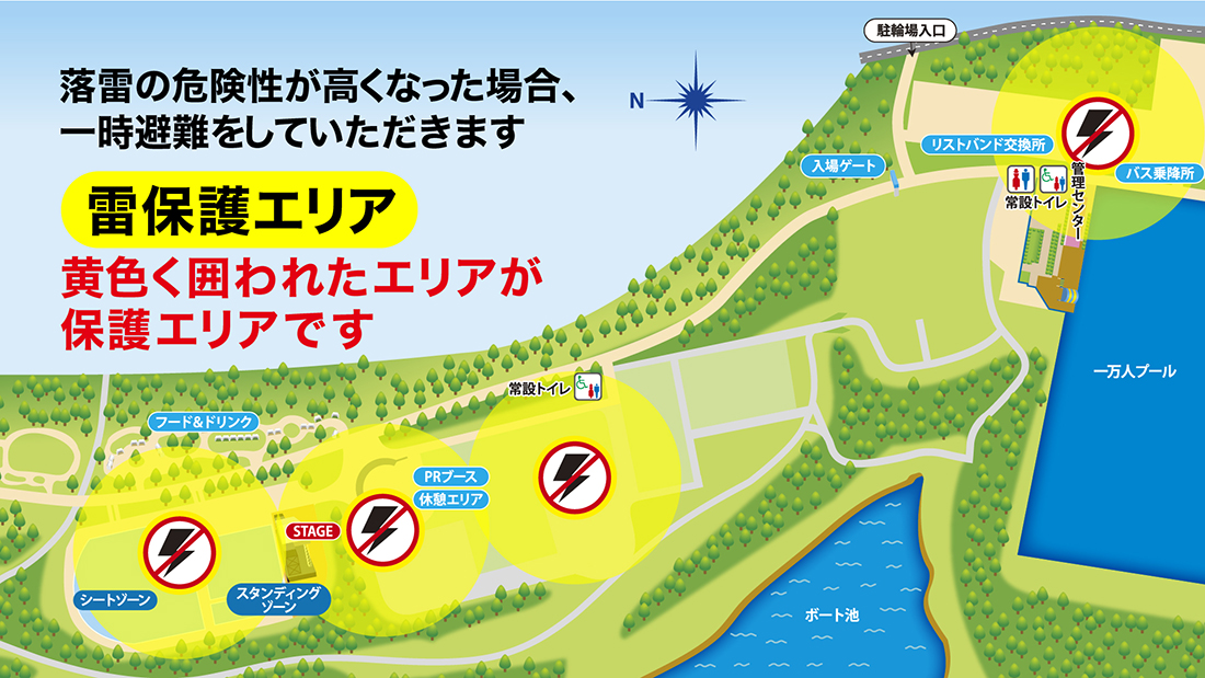 会場内には、4か所の避雷ドームを設置しております。 雷雲の接近が予想される場合は、スタッフの指示に従い、最も近い雷保護エリアへの移動をお願いいたします。
