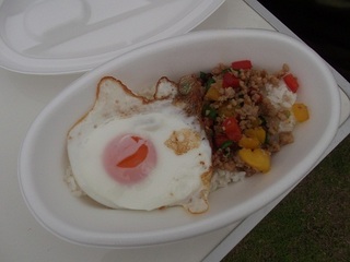 (鶏ひき肉+バジルの風味で、目玉焼きとごはんをまぜて食べます!!)を頂き、
