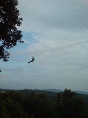 ワイヤーで一気に山を下るんでんすが、森の上を飛ぶので