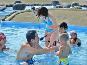 リポーターのムサシちゃんは、美原公園水泳プールに