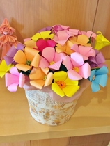 折り紙を使っていて、中央と花びらの色が違っていて