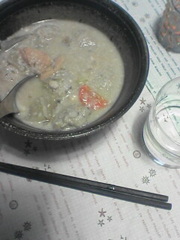 お土産に「酒かす」を頂いちゃいました。 こだわりの酒「開華」の酒かすなので、香りも豊か(^ー^) せっかくだからおいしく戴こうと思って鮭を入れた粕汁、 『三平汁』を作ってみました。 しかも鍋いっぱい(^^;) ちなみに酒かすが入らないと『石狩鍋』になりますー。 見た目は地味だけど、味は・・・うまーいー!\(^o^)/ 酒かすが入るといっそうコクがでて味わい深くなります。 鮭も旨いし、野菜も旨い。いや~、実に温まります。 がっつり食べたけど、まだ鍋7分目残っているので ・・・あと2日くらい三平汁になるかな(^^;) ![]() |