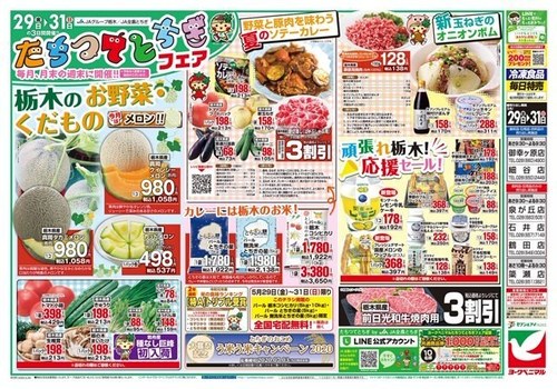今がまさに旬の果物!! 普段は、JAはが野管内の直売所などでしか購入できないので、“幻のメロン”とも言われています。 現在出荷されている品種は主に…青肉の「タカミメロン」と赤肉の「クインシーメロン」。 ・タカミメロンは…果肉は綺麗な緑色、爽やかな甘みとなめらかな口当たりが特長のメロン。 ・クインシーメロンは…果肉は鮮やかなオレンジ色、ジューシーで深みのある甘さのメロン。 真岡メロンは、JAはが野管内の直売所の他、 インターネット通販サイト「JAタウン とちぎ新鮮倉庫」でも購入することができます。 現在、JAタウンでは送料無料キャンペーンを実施中ですので、 ぜひこの機会にご利用いただければと思います。 そして、県内のヨークベニマルでもお買い求めいただけます! ヨークベニマルでは、毎月月末の週末に、栃木県内全店で「たちつてとちぎフェア」を開催中! なんと、今月で“1周年”を迎えることができました! …ということで、今月から、フェア期間を拡大し、 金・土・日曜日の3日間の開催となります!!! 今月のフェアは、明後日29日(金)~31日(日)! 本日ご紹介した「真岡メロン」をはじめ、とちぎのお米・お肉・お野菜など、 たくさんのおすすめ商品を取り揃えて、皆様をお待ちしております。 金曜日には、折込チラシも入る予定ですので、 ぜひご覧いただき、フェア当日はお近くの店舗にご来店ください。 ![]() ※そして今回は…リスナーのみなさんの中から抽選で2名の方に、