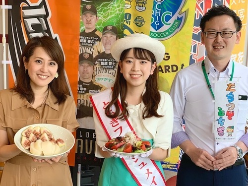 ![]() 前田さんは、先月スタジオにも来てくれた 大出さんと立石さんと一緒に、 栃木県産農畜産物のイメージアップのために キャンペーンやイベントに参加し、品質の良さや美味しさを 県内外に向けてPR活動をされています♪ そして…毎月月末の週末に、ヨークベニマル栃木県内全店で開催している 「たちつてとちぎフェア」。 今月は、今週末の27日(金)~29日(日)の3日間の開催です!! 今回も栃木自慢の夏野菜やお米、お肉、加工品など、 たくさんの商品を取り揃えて、皆様をお待ちしております。 本日は…今がまさに旬を迎えている、栃木のなすとトマトを使った 『豚しゃぶサラダ』をいただきます! ![]() 【栃木のなすとトマトの豚しゃぶサラダ】 材料… 豚肉・なす・トマト・レタス・長ねぎ・キユーピー「ごま油&ガーリックドレッシング」。 作り方… なすはひと口大に切り、水にさらした後、レンジ(500W)で1分30秒加熱 水気をきります。 トマトはくし形切り、レタスはひと口大にちぎり、長ねぎは白髪ねぎにします。 豚肉は沸騰直前のお湯でさっとゆで、水にとって水気をよくきります。 お皿に、レタスをしいて、なす・トマト・豚肉を盛りつけて、 ドレッシングをかけて、 白髪ねぎをのせてできあがり~(簡単!) ★ヨークベニマルのフェアでは、このおすすめメニューのレシピ動画が店頭で放送中! 今月のレシピ動画では、とちぎフレッシュメイトの大出さんがナレーションを務めています! 店頭のモニターで見られる他、全農とちぎのYouTubeチャンネルでも公開しているので、 ぜひご覧ください。 ![]() そして!! デザートには、とちぎの「梨」と「いちじく」はいかがでしょうか♪ 本日は、とちぎの「幸水」と「いちじく」もいただきました~ 【幸水梨】幸水は、甘くて果汁たっぷり、ジューシーな果肉が特長! 【いちじく】県南のJA佐野で生産されています。主に赤いちじくを栽培! |