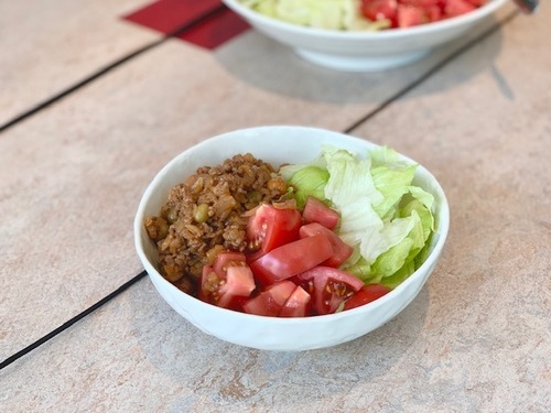 おいしいとちぎ米に、タコミート&レタス、そしてトマトを乗せて完成!!