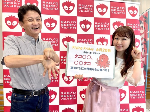 渡辺裕介 と 吉澤美菜 がお送りする、 【Flying Friday】 スタジオBHILLSから生放送! 今日のメッセージテーマは… 【 タコ○○、○○タコ 】 夏至ってタコを食べるようです!(関西) ということで、 今日は「タコ(蛸)or凧」の話。 たこ焼き・たこせんべい、 酢だこ・タコの刺身、 ペンだこ、耳にタコができる、など タコ○○、○○タコのについて、 お便り、お待ちしていまーす! ![]() |