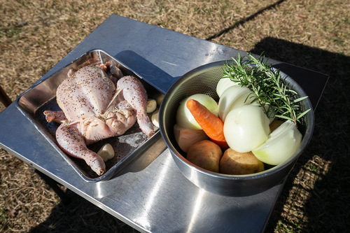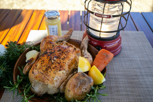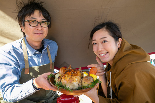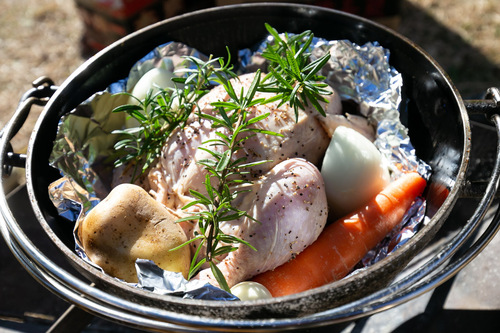 お手入れもラクで初めての方にオススメだそうです。 すぐに鶏肉を中に入れるのではなく、 まずはダッチオーブンを温めるための プレヒートをします。 あたたまってきたところで、 鶏肉と野菜を入れます! そしてフタをして、フタの上にも炭をのせます。 そして1時間ほど待つだけ・・・ ![]() 簡単に本格的なローストチキンのできあがり!