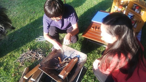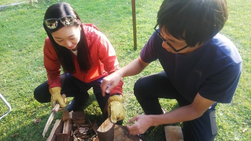 今回は薪割りから挑戦。 ナタは柄の部分は刃より下に下がっていた方が 自分の方に向かないので安全です。 使うときは注意しましょう! ![]() そのあとは実際に薪を組んで火を起こします。