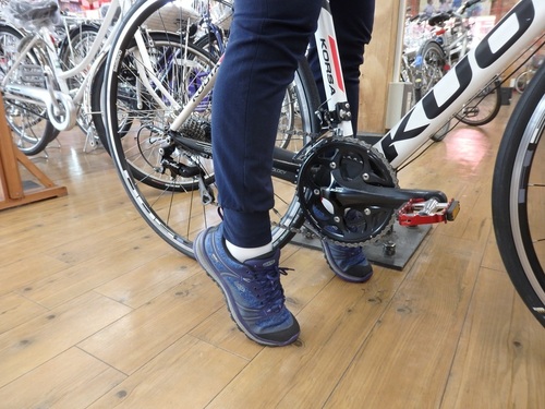 ★サイズ 大きすぎても、小さすぎても、 バイクをうまくコントロールできません。 (ハンドルが遠すぎると、曲がる、止まるが難しくなります) ★装備 初めてロードバイクに乗るときは補助ブレーキレバーがあるといいですよ。 また、ブレーキに自信のない方はブレーキシューを交換するだけでも 安全に止まることができます。 ★デザイン サイズ、装備と同じくらい重要なのは、『見た目』です! どうせ乗るなら、デザインにもこだわって選ぶと、より愛着がわきます。 ぜひこのポイントで選んでみてくださいね。 サドルの高さは、サドルにまたがって、 少しヒザに余裕ができるくらいがいいそうです。 ![]() ![]() 足をつくとこんな感じです。
