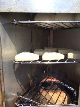 これを「スモーカー」という、オカモチのような中にアミ状の棚があるBOXに! 上の棚に食材を、一番下の段に香り付けのスモークウッドと呼ばれる 固形石鹸みたいなものを置いて、火をつけるだけ。 炎は出さないで…お香のように煙だけにして、あとは放置。 だいたい1時間程度で完成~ ![]() スモークたまご と スモークチーズ…間違いなしです!