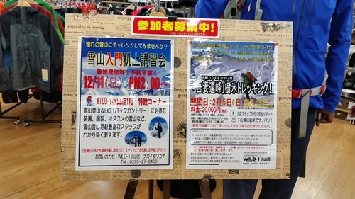 「WILD-1小山店」の永井さんに紹介してもらいました。 雪や氷、寒さによって閉ざされた冬山の世界は、 普段は目にしたことも無いような素晴らしい風景と、 静けさの中で雪を踏みしめる音だけが響く、冬でしか味わえない空気感! そこには、言葉にできない感動が! 今回は、雪山登山やスノーシューを楽しむために必要な道具を紹介してもらいました! WILD-1小山店では、12月11日(日)午後2時から小山店内特設会場にて 「雪山入門机上(きじょう)講習会」を開催します。 雪山を楽しむための基本的な知識や装備などを、経験豊富なスタッフが わかりやすく説明してくれます。 これから雪山にトライしてみたいという方におすすめですよ! お申し込みや参加費などは必要ないということですので、ぜひお気軽にご参加ください。 ![]() |