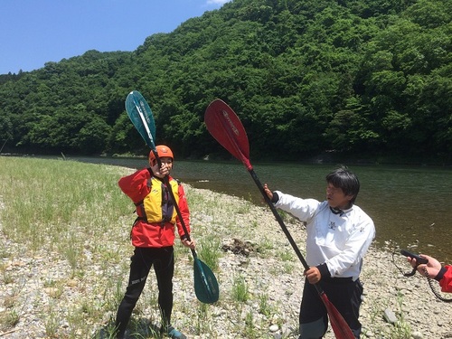 斉藤さんに、パドルの使い方を教えてもらって、いよいよ川の中へ…