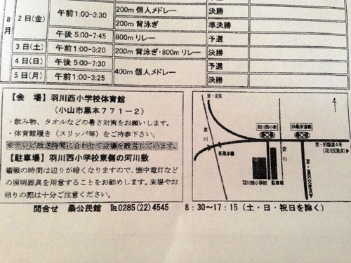 合わせて、 200m自由形で決勝に進出を決めています。 萩野選手は「2種目で決勝に残れたのは幸せ。 その幸せを1つ1つ、かみしめながら泳ぎたい」 とコメントしています。 背泳ぎでは、入江陵介選手も決勝への進出を決めていて 日本人2人そろっての表彰台が期待されています。 また、自由形では、(萩野選手が目標とする) マルチスイマー ライアン・ロクテ選手が登場です‼ 100m平泳ぎ決勝に臨んだ北島選手は6位でした。 萩野選手の母校、小山市の羽川西小学校では、 パブリックビューイングが行われていますよ‼ こちらに詳細があります。 まず、スケジュールはこのような形。 決勝は、現地時間で夜6時からなので、時差が7時間ある 日本では、深夜になりますね。 ![]() 場所は、こちら。 ![]() どうぞ参考になさってください。 |