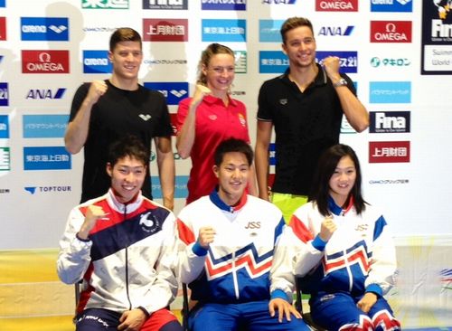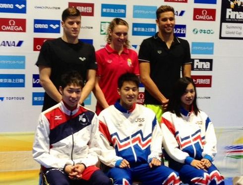 ワールドカップの記者会見での一コマ公式練習の日に行われた公式記者会見。 ![]() 萩野公介選手、瀬戸大也選手、渡部香生子選手。海外選手はハンガリーのダニエル・ジュルタ選手、カティンカ・ホッスー選手、南アフリカのチャド・レクロー選手(いずれも左から) ![]() 普通に写真を撮った後に、何かポーズをとろうということになってガッツポーズの選手たち。和やかな雰囲気に。 ![]() |