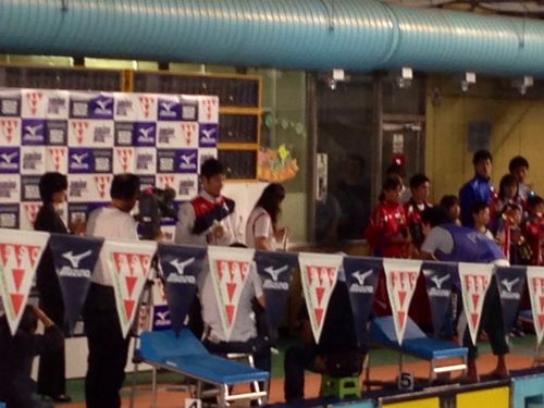 東京SC招待記録会での一コマ今までほとんど出たことがないという平泳ぎに出場。 一番手前が山口選手、その隣が萩野選手。 ![]() ![]() 萩野選手は、この記録会で、最優秀選手であり、次の世代を担う選手に与えられる田畑杯を受賞しました。写真、右側に並んでいる選手たちは、各年齢区別ごとに表彰された選手です。 ![]() |