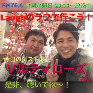 毎週水曜日20時55分から「Laughのラフで行こう!」という番組のパーソナリティーをやらせていただいています♫ ライブ会場や街中で出会った方々に最近あった嬉しかったことや楽しかったこと、楽しみにしていることなどをインタビューで聞きまして、 そのハッピーについてコメントとワンフレーズ曲を作ってお届けする番組となっています。 聞くだけで気持ちがポカポカとする・・・そんな番組です♫ 僕のまとまりのない!?コメントにも注目してくださいね(笑) ![]() 僕の後ろに写っている方はギタリストである「堀田カツノブ」さん。