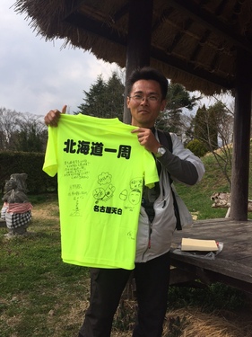 皆さん、最近ハッピーですか? この番組、「Laughのラフで行こう」はあなたの嬉しいこと、楽しいことを紹介していく番組です。 リスナーのみなさんも一緒にハッピーになってくれたら嬉しいです。 最近あった僕のハッピーな出来事は「自転車のイベントに参加してきまして23kmを無事に完走できたこと」です! 実は、栃木県さくら市で行われたポタリングのイベントに参加しまして、一昨年にも一度参加したことがあるイベントなんですよ~。 一昨年にSAKURA FMという情報番組でレポーターをやらせていただいたんですが、そのときのスタッフさんからお声をかけていただき、参加させていただきました!! いや~、終わった後はすごく疲れましたけど楽しかったです。 桜を眺めながらの自転車旅・・・。また参加したいですね~。 そして今夜のLaughのラフで行こうですが、今回出演してくださった「かたのさん」は先日、那須町でお会いした愛知県名古屋市にお住まいの男性の方。 たまたま、かたのさんに道を聞かれ、お話を聞いているとすごいチャレンジをしている方ということでインタビューしちゃいました。 そんなかたのさんのハッピーな出来事は先日、自転車での本州一周を終えたということ!! そして今はまた愛知県から北上し、次は自転車で北海道を一周するそうです! 一応、9月を目標にして走っているそうですよ~。 チャレンジのきっかけも聞いてみたんですが、この年になって、何か1つ自分で成し遂げたい。という気持ちがふつふつと沸いてきたそうなんです。 そこできちんと行動に移すことができる。かたのさんの有限実行の姿勢、僕も見習わなければ・・・かたのさん!栃木県から応援していますよ~!!また、お会いしましょう!! また来週はどんな人のハッピーが登場するんでしょうか?お楽しみに! ではこの時間のお相手はシンガーソングライターのラフでした。 チャレンジ中のかたのさん。だいぶ日焼けをしたそうです。僕もかたのさんが持っているシャツにメッセージを書かせていただきました。 ![]() |