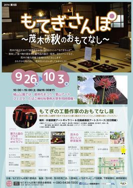 [メインディッシュ]今週のメインディッシュ9月27日![]() ということでDJエイミーが辿り付いたのは、茂木町縦町通り沿いにある“叶屋旅館” です。 さあ今回は茂木町の総力をあげて皆様をおもてなしするイベント“もてぎさんぽ”について新鮮な情報を仕入れましたよ! 新鮮な情報は“もてぎさんぽ”実行委員長の木漆工芸家の松﨑さんです! ![]() この“もてぎさんぽ”とは、美味しい食べ物の提供や工芸作品の展示と販売、文化イベントなどを茂木の街中で開催し、茂木をゆったり散歩しながら茂木の魅力を存分に味わってもらえるようにおもてなしをするイベントです! ![]() 縦町通りを中心とし、各店舗、様々なスペースで展示や販売を行っています。 そして城山公園では“彼岸花まつり”、先週番組でもお伝えした“もてぎ里山アートフェスタ2014”、そして“たばこ神社秋季例大祭”も同時開催しています。 とにかく百聞は一見に如かずです! ぜひ今週末は茂木まちに足を運び、茂木の魅力を味わってみてください! 茂木に住みたくなってしまういくらい“もてぎさんぽ”はナイスです! |