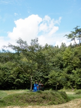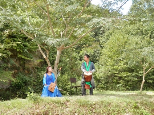 馬頭琴奏者の美炎(みほ)さんと ドラム・パーカッションの前田さん。 本番はさらにキーボード奏者が加わります。 楽器を持って、みんなで棚田へ。 ![]() 山の棚田は、普段は地元の方たちでさえ