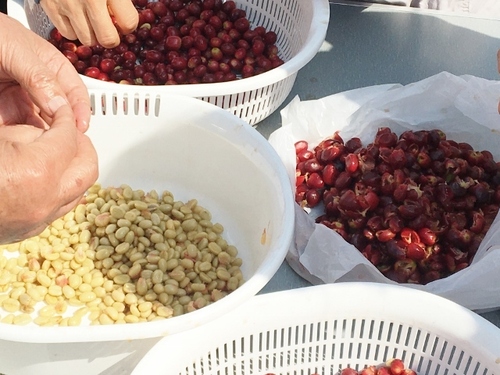 数年前から取り組んでいる、コーヒーの栽培。 2年ぶりにハウスの中を見せてもらうと… ![]() すごい成長! 160cmくらいしかなかった木は 倍以上に育っていました。 取材に伺ったこの日は 少人数限定でコーヒーの摘み取り体験を開催。 コーヒーチェリーと呼ばれる コーヒーの実を採ります。 軸の方まで赤くなっている実を選ぶのがポイント。 実の中には、コーヒー豆のような形の 種?が2つ入っています。 ![]() 袋いっぱいに収穫した実を洗って 手作業で一粒一粒、実と種を分けます。 ちなみに赤い実の部分は「カスカラ」と呼ばれ 参加者の皆さんは持ち帰って ジャムにしたり お茶にして飲んだりするのだそう。 ![]() なるほど!これを炒ってコーヒー豆にするのね! と、思いきや… さらに これを数日間、水に浸け、 時間をかけて乾燥させ… そうすると下の写真の手前のようになるので これをさらに手で薄皮を剥く!!! 奥の器の中の小さな粒が見えるでしょうか? ![]() この生豆を洗ったり焙煎したりして ようやく!あの見慣れた茶色いコーヒー豆になるのです。 ええー…!コーヒーって実はすんごい 手間のかかっている飲み物なんじゃないですか…!! 参加者の皆さんは、収穫後に 「自家焙煎珈琲 コトリ」さんが用意してくれた アイスコーヒーを 「できあがるまでの苦労を知ってから飲むと よりいっそう美味しく感じます」と 嬉しそうに飲んでいました。 収穫の大変さを経験してから、 フェアトレードコーヒーを選ぶように なったという方もいらっしゃいましたよ。 ------- 那珂川町産コーヒーは 少しずつ、でも確実に 成長しています。 今年より来年、来年より再来年。 時とともに一杯でも多く、 那珂川町産コーヒーが飲めるようになるかもしれません。 「コーヒーを飲むために那珂川町に来たよ!」 という人たちが これからたくさん増えていきますように(*´ω`*) 那珂川町産コーヒーの情報は 「なかよしマンゴー」のFacebookページなどで アップされています。 ◎2日間しか咲かないというコーヒーの花が見れました! 見た目も香りも、ジャスミンにそっくりです↓ ![]() |