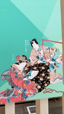 「双筆五十三次 桑名」 「月耕随筆 水江浦島」は どちらも 浦島太郎 のワンシーンを描いたもの。 「双筆五十三次 桑名」は 風景を歌川広重、 人物を三代豊国が担当した合作。 「月耕随筆 水江浦島」は 明治時代の浮世絵師・尾方月耕の作品で 水彩画のような色合いに惹かれます。 同じ物語をモチーフにしても 絵師や時代でいろいろな描き方があるんですね。 --- 展示室2の後半は 本に描かれた絵をメインとしたコーナー。 もちろん手に取ることはできませんが・・・ 迫力を感じてもらえるように!と 何点かはパネルで拡大展示されています。 声や音が聞こえてきそうなくらいリアル! もしや、日本のマンガの原点って これなのでは?なんて思っちゃいました。 ちなみに展示室や、ロビーにある エメラルドグリーンの看板。近づくと… ![]() ![]() あっ、キャラがしゃべってる!