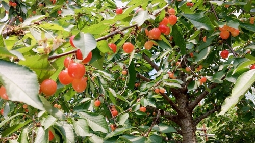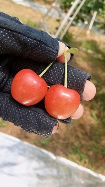 贈答用などの宅配を行っているほか、 さくらんぼ狩りを楽しむことも出来ます! 30分2,000円で食べ放題っ!!(´▽`*) さくらんぼ狩りができる木には 目印のテープが付いています。 見て見て!この大きな実!! ![]() 品種によって、