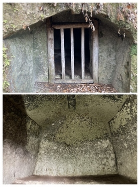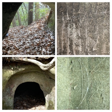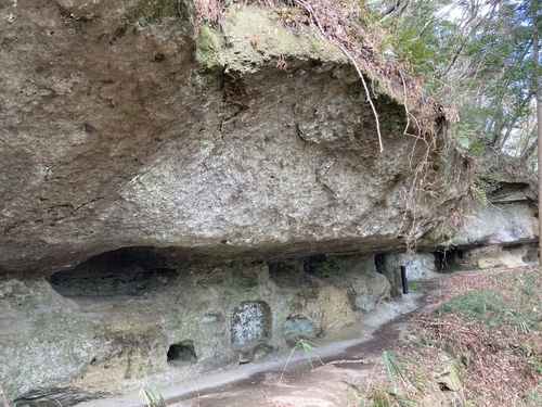 凝灰岩を彫って作ったもので 中はファミリー用のテントくらいの広さ。 天井は屋根のような斜めの勾配、 その中央には梁のような凸部分。 外には庇のようなものもあって、 まさに「家」のような作りです。 精巧な点では全国的にみても屈指のものだとか。 : 昭和9年には国の史跡となった唐の御所ですが 当時にはすでに中のものは無かったそうで 誰が埋葬されていたのか、埋葬品はあったのかなど まだまだ謎も多いとか。 現在も、国士舘大学と協力して 調査が続行されているそうです。 これからどんなことが解明されていくのか!? 想像するとワクワクします(´▽`*) : また唐の御所の周辺には 遠見穴、姫穴などの名称で呼ばれる横穴墓があって 中に入れるものもあります。 ※崩落しているものや 柵がある所には入らないでください 「遠見穴」の中には 葉っぱや弓?のような彫跡が。 ![]() :