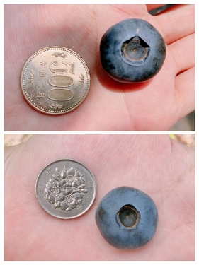早生系のスパータングローが食べ頃。 特徴は、皮が薄く、トロッとした食感で 甘みがあって、種が少ないこと。 (ジャムにしても 美味しい!) そして…… なんといっても、この粒の大きさっっ!!! ![]() 完熟ブルーベリーの見極めポイントは