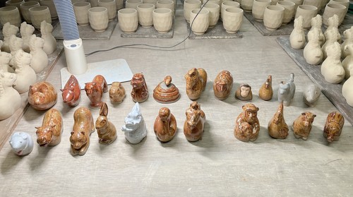この置物を製作しているのは「藤田製陶所」6代目の藤田眞一さん。 毎年、デザインにはかなり頭を悩ませ、試行錯誤してきたそう。 初期はリアルな造形が特徴でしたが 置物づくりをするうえでのコツをつかんできて 最近はデフォルメされた形に変化してきました。 ↓一巡目の申・酉・戌・亥 ![]() ◇
