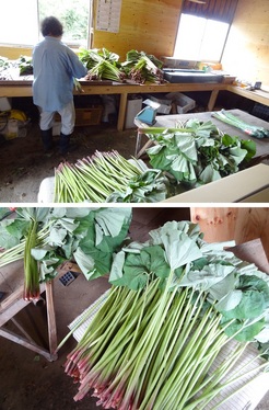 ・・山奥(笑) ヤマメ釣りが盛んなヤマメの里を大内の方にひたすら車を走らせ・・ 民家もまばらな田園風景の中に・・ありました!見事な蕗畑です! 大那地(おおなち)という地区の斎藤信一さん・とみさんご夫妻の 蕗畑は約450㎡!! いつもの年なら5月半ばには収穫の殆どが終わっているという斉藤さん。 今年は天候の関係で5月後半でもまだ収穫が終わらないのだそうです。 寒暖の差が大きな那珂川町の蕗はどこよりも味が濃く美味しいと いうことで・・ご覧ください!1本が70~80cmはあろうかと言う 本当に立派な蕗です! ![]() 雨にあたると葉が萎れてしまうということで雨の季節の前に