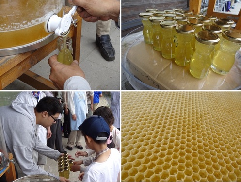 このはちみつを細かい網で濾して下のタンクには 細いはちみつの雨が!!!;:il !:il|!l|il|;ザアアァァ…:il|!i;i|!!;: あぁ~・・下で口を開けていたい(笑)←まさにぷーさんだな(笑) 左下の蜂の巣の板は黄色い方が1年物。 今年初めて作った巣です。 黒っぽい方は3年物。 毎年新しいものを入れるのではなくしぼり終わった巣はまた 蜂の巣箱に戻します。 シーズンが終わったらカビなどが生えないように丁寧に管理すれば 10年くらい使えるんだそうです! (*・∀・)ノ"ヘェ~ そして右下の蜂の巣は5年物。 更にひとつひとつの巣がしっかりとしていて壁も厚くなっています。 香りも全然違う!1年物はほのかな甘い香りですが5年物となれば かなりしっかりとした濃厚な香りです! ![]() 貯まったはちみつを瓶に詰めます。