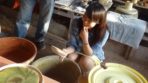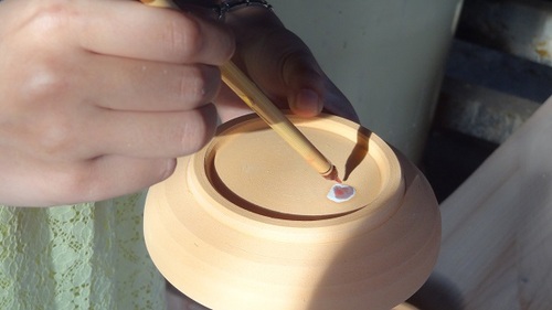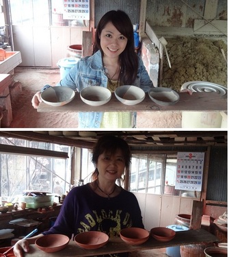 焼いた後にどれがどっちかわかるように 「名前」を刻印(?)しました。 藤田師匠が器に「K」と「S]と印をつけてくれたところに 薬を塗ってその上に「蝋」を塗ります こうすることで焼きあがった時にくっきりと 文字が浮かび上がるのだそうです。 ![]() そして完成!!
