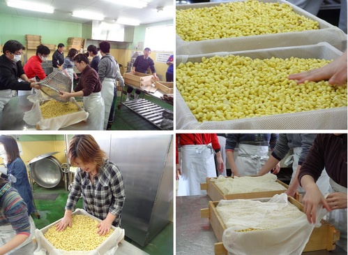 まずは前日に水に浸しておいた大豆を木枠に入れ蒸しあげます。