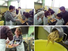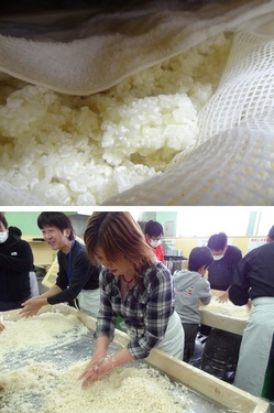 いったん取り出します。お米の上にふかふかした綿のようなものが・・ これが「発酵」!!!! この発酵したお米を台の上に広げて塊がないようにぽろぽろに もみほぐしていき再び木枠に入れて保温器に戻します。 同じお米なのに種類や新米と前年度米との違いなどで もっちりしっとりのものとさらさらしたものがあって こんなにも違うものなのかと驚きです! ![]() さてここでランチタイム♪