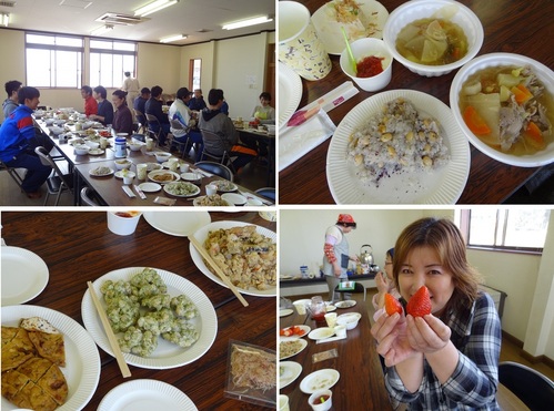 奥様達が心を込めて作ってくださったご馳走が並びます。 ししまる汁・豚汁・古代米と大豆のおこわ・おから・お豆腐 がんもどき・大豆のフリッター・ヨーグルト・いちご♪ 素朴ながらもどれも美味しくておなかいーっぱい! そしてこに苺!!あまーいとちおとめと今話題の「スカイベリー」 でかいっ!! 比べてみれば一目瞭然(笑) 甘味に関しては正直現在開発中というだけあって苺の女王とちおとめ には若干及ばずといった感はありましたが大きさに関しては なんというインパクトでしょう! スカイベリーが市場に出回るころにはとちおとめに並ぶ 美味しさと大きさで日本一の苺が栃木の代表種になることでしょう♪ ![]() では午後の作業に入りましょう!