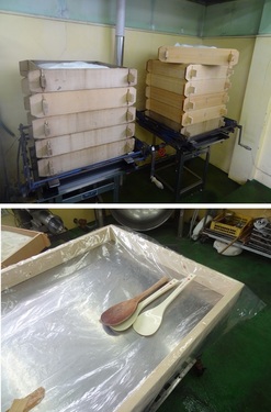 蒸しあげられている白米でした。 3m×1.5mほどの台に手作りの木枠をあてがいその枠の中にビニールを敷き 蒸し上がったお米を広げたらうちわでせっせとあおいで40度くらいまで 冷ましていきます。 パタパタ(("Q_(´▽`*)パタパタ ![]() その一部のお米をボールにとって麹菌と合わせ麹のタネを作ります。