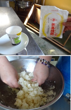 ![]() 広げて冷ましたお米に麹菌を振りまいてよおーーーっく混ぜ合わせます。