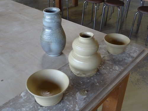 落着いて一旦土をうまくもとに戻し改めて成形していきます。 (この時のやり直しが後に・・(笑)) おぉ~っ!今度はうまくクビレのある花瓶になってきたではありませんか! 一時はどうなることやら・・というBigサイズの茶道の茶わんみたいな ものからよくここまでこじんまりとまとまりましたね(笑) 花瓶の口元も慎重に仕上げています。 そして・・・完成!!!!? ・・・・・あれ? 見本の花瓶ってこんなんでしたっけ? ![]() 並べてみたら一目瞭然。 全く違いますね(笑) ふたりともまだまだ修業が足りないようです。 Shinlyは粘土が余ったのでお茶碗(?)をいわゆる「夫婦」で 作ってみましたが・・「同じ形」って難しいんですね。 あらたな課題も見つかったようです。 ![]() そして今回の「花瓶」は同じ小砂にある「松並陶苑」さんの