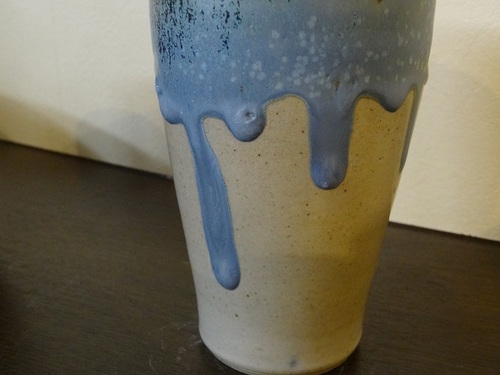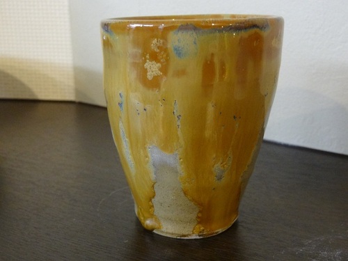 アクセントになっています。 これまたシブいっ!! しかし相当頑張って吹いた割には艶の部分が少なかったと大反省。 色の出方は一度焼いてみると釉薬のつけ具合がどの程度だと どんな色味になってどの程度流れるかなどを学びます。 今度吹付釉薬を使用するときは前回より多めに吹付よう・・とかね。 そしてこちらはその釉薬がちょっとたっぷりすぎてしまった 佳代ちゃんのカップ・・ ![]() 金結晶の色味はなかなかいい色ではありますが・・
