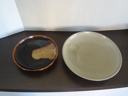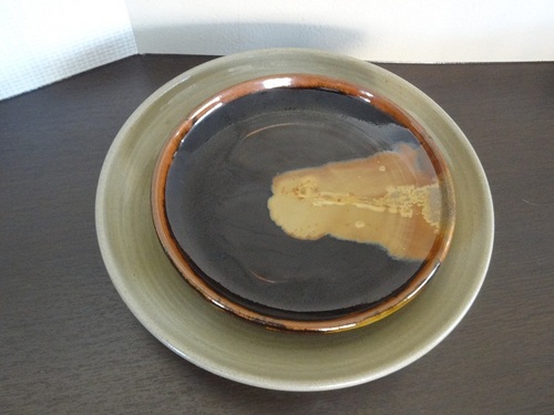 肉じゃが乗せてもさながら「おばんざい屋」さん♪ まぁ問題は佳代ちゃんが肉じゃがを・・作・・いや・・ 言いますまい・・(笑) (。´-д-) そしてShinlyの苔玉受け皿 (^0^)y○ 金結晶の釉薬がどのくらい溶けて 黒い部分に流れるたか・・ (⌒◇⌒;;)げっ やっぱりちょっと釉薬かけ過ぎちゃったみたいですね・・ 細く残した素焼き部分には金結晶が 綺麗に出ましたが・・黒い部分にかかった金色は思いのほか だらっと流れてしまいもったりした感じに・・ 質感や色合い自体はまぁまぁらしいですが・・ o( >ω<)o" 実際苔玉を乗せてみたいところですがお皿は出来たけど 苔玉は差し上げてしまったので・・新たに苔玉を 購入するかまた新たに作るか・・ Σ(-x-;) 暫くは普通にお皿として使うか待機皿か・・(笑) 食器としては重すぎるような・・なんせ佳代ちゃんの大皿より 遥かに重たいんですから(笑) ![]() 並べてみるといずれもなかなかの力作ではありませんか? 今回は渋みと落ち着きのあるまずまずな仕上がりとなりました。 v(^ー^)v ![]() ちなみに重ねてみたらこんなに大きさが違うんです!!