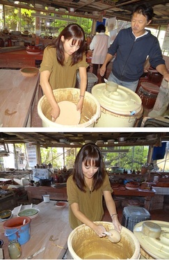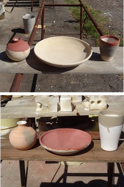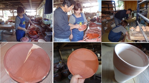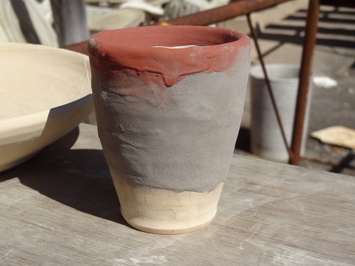 よく見えませんが1輪挿しに何かを吹きかけているような・・ 実は師匠手作りのペットボトルを利用した釉薬吹き付け器(?) ノズルの部分に思いっきり息を吹き入れるのですが これがなかなか釉薬が出てこない(笑) 硬い風船を膨らませるように息を止めて一気に 「ふぅぅぅぅぅぅ~っっっ」 Oo。(>。<) 細かーい砂鉄のような粉を頑張って頑張って吹き付けていきます。 これはどんな色合いになるんでしょう? ![]() というわけで上が佳代ちゃん 下がShinlyの作品