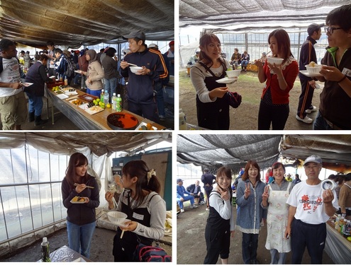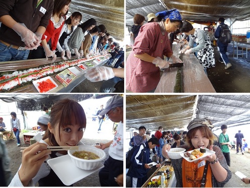 「巨大太巻き」を作ります! 全長20m位でしょうか・・みんなでずらーっと並んで それぞれが具を乗せ一斉に「せーの!」で巻いてゆきます! ( ̄∇ ̄*)o"( ̄∇ ̄*)o"( ̄0 ̄*)ノ" まぁ巻くよりこれを切る方が大変かも・・(笑) ヽ(◎Д◎;)ノウヒョーーーー みんな思い思いに具を乗せたので切り分けると面白いように 具の配分が違ってそれがまた何とも手作り感があっていい(笑) 他にも地域の方が持ち寄ってくださったデザートや 平山さんの梨や皆さんで作って下さった豚汁などなど。。 何を食べても美味しい美味しい!! ヾ( ´¬`)ノ(。´∀`)ノ▲ ![]() 食べながら各国からの留学生や地元の方との楽しいお喋りも