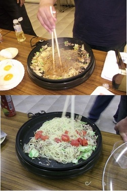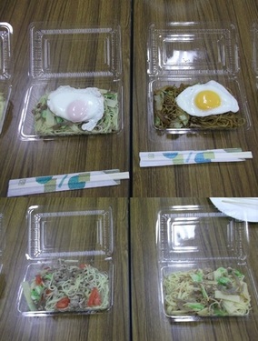 この香りはアレですね! おーっ!?こちらには何か変わったものが 投入されました!これはっ!! 出来上がりぃ~♪ 本番を想定してパック詰めされた4種類の焼きそば♪ ![]() でまみんなで試食します!!