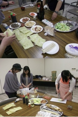 様々な那珂川町の素材や味付けが検討されました♪ そして今回4月16日(月)の第2回目の会議が 開催され1回目で検討された素材と味付けで 何種類か作りテイスティングが行われました♪ まずは素材を並べいざ準備♪ ここで既に食べやすさなども考慮していきます♪ 基本的に絶対に入れよう!という素材も決まり 3種類の味付けでバリエーションは5種類(?) 那珂良しチームもしっかりお手伝い♪ 切ったり炒めたりのShinlyに・・皮をむく佳代姫w "●━ヽ(^.^∬ クッキング♪ ![]() みんなで交代に手伝いながら出来上がった