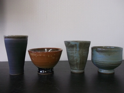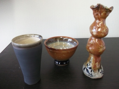 写真左側2つが板橋画伯の作品 ではこれも画伯にポイントを伺ってみましょう♪ 深いものに関しては細くスタイリッシュに! 艶のないマットな素焼きの風合いがいい感じでしょ♪ 口元の部分は口当たりがいいように艶にしてくれたのは 藤田師匠ですけど(笑) お茶碗は想像以上にいい小砂焼きらしい金結晶が出て すごーくいいでしょー♪ ちょっと欲張って釉薬かけすぎて実は裏側は液だれ状態で 藤田師匠の腕をもってしても削りきれずにかけてしまったのは 残念でした(笑) そうなんです・・写真はスペースの都合上載せられなかったのですが お茶碗の一番下のところが欠けちゃったのですが使うのには支障は ありません♪持ち方によってちょーっと痛いだけです(笑) さてShinlyの作品はというと・・ 深いものに関しては思った以上に小ぶりになってしまいました・・ 理想はビアマグのようなイメージだったのですが・・でも案外 手にはなじむ程よい大きさに仕上がったので結果おーらい(笑) お茶碗は上品な形を重視したので形的にはイメージ通りでしたが これを見て「湯呑?」「ぐい飲みにはでかいよね」という声は 聞かなかったことにします(笑) ・・湯呑って・・どんだけお茶入るんだよ! 色に関しては茶わんと湯呑は「お揃い」にしたかったので 同じ色を選択しましたが予定では「蒼」になるはずが・・ 神様は「緑」に仕上げてくれちゃったのは悪くないけど ちょっと残念だったかな・・ ちなみにバランス的には歪みもなくいい作品かと・・ 自画自賛(笑) では藤田師匠の判定は!!! 個性が出ましたね・・(笑) でも佳代ちゃんの花入れは穴あいてないよね(笑) まぁ・・・・引き分けだね(笑) そう言わざるを得ないほど作品が全く違うものに仕上がっちゃった から仕方ないよね(笑) そして茶わん&深いものに関しての判定は!!! うん・・引き分け(笑) をいっ!!(笑)と突込みを入れたくなりましたが 師匠の深いお言葉は続きます こういう作品が仕上がるとさ 次に何を作ろうかなと思えるでしょう? それでいいんだよ~次に期待してます ![]() ![]() 結果だけ聞くと無難に引き分けという感じはしなくもありませんが 師匠のおっしゃる通り!確かに次はこうしようとかここに気を付けよう とかこんな色もいいかなとかふつふつと闘志が湧いてきたのはお見通し(笑) さすがです(笑) 板橋画伯の作品は3点 Shinlyの作品は4点 話題に触れなかったShinlyの小っちゃい湯呑は気の迷いで 歪んだ上に色付けも筆をはじく勢いで色を散らしてみたものの 思いのほか地味~になってしまったので 「この作品はそっとしておいてください・・orz 」 というわけで次回からは「細長いもの」をテーマに「1輪挿し」に挑戦です♪ 今回の成功・失敗の部分を反省し活かしどんな作品が出来上がるのか!? お楽しみにぃ~♪ |